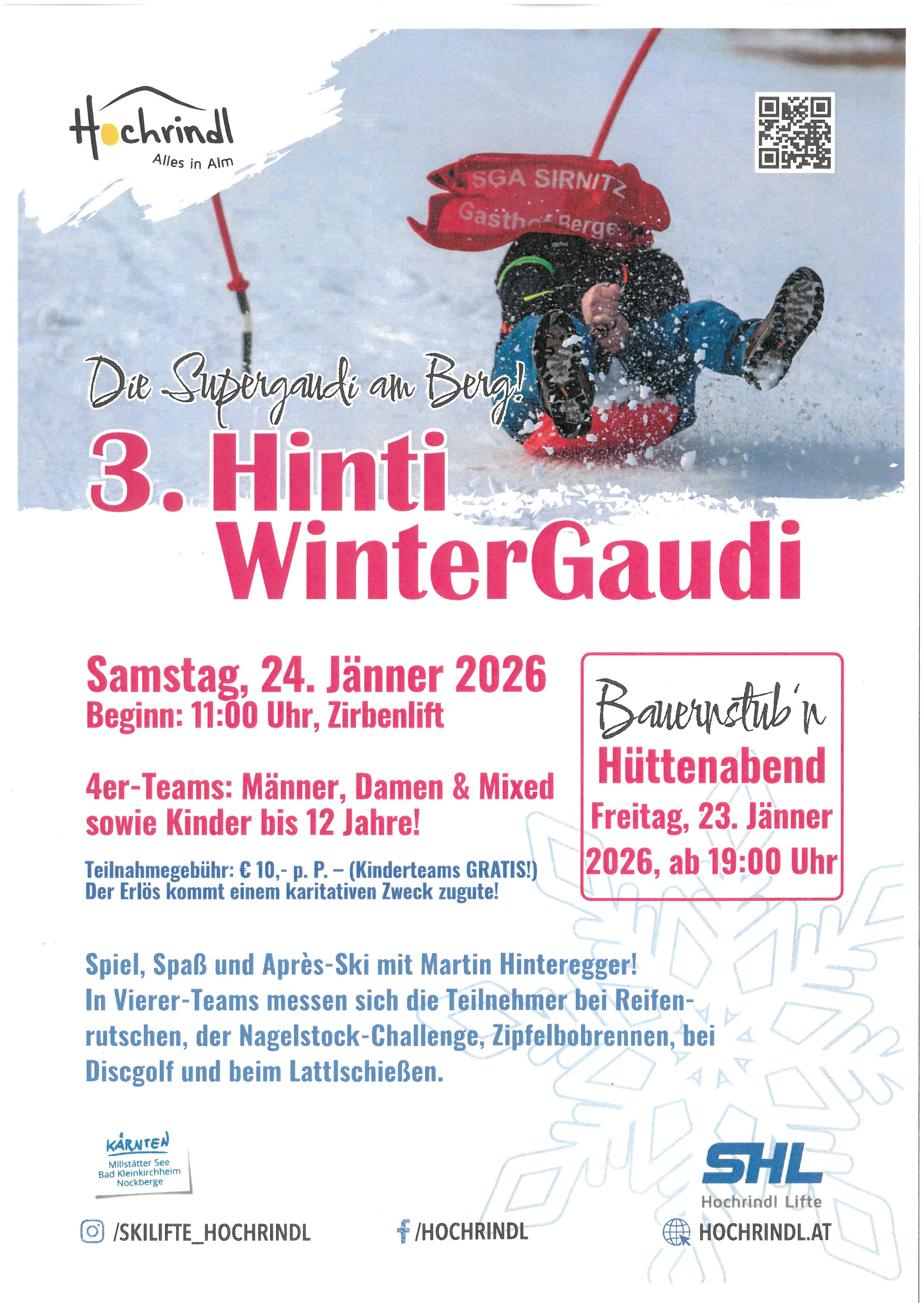 3. Winter-HintiCup. Spiel & Gaudi im Schnee. Jeder kann mitmachen!!! Anmelden unter https://www.hochrindl.at/hinti-wintergaudi/