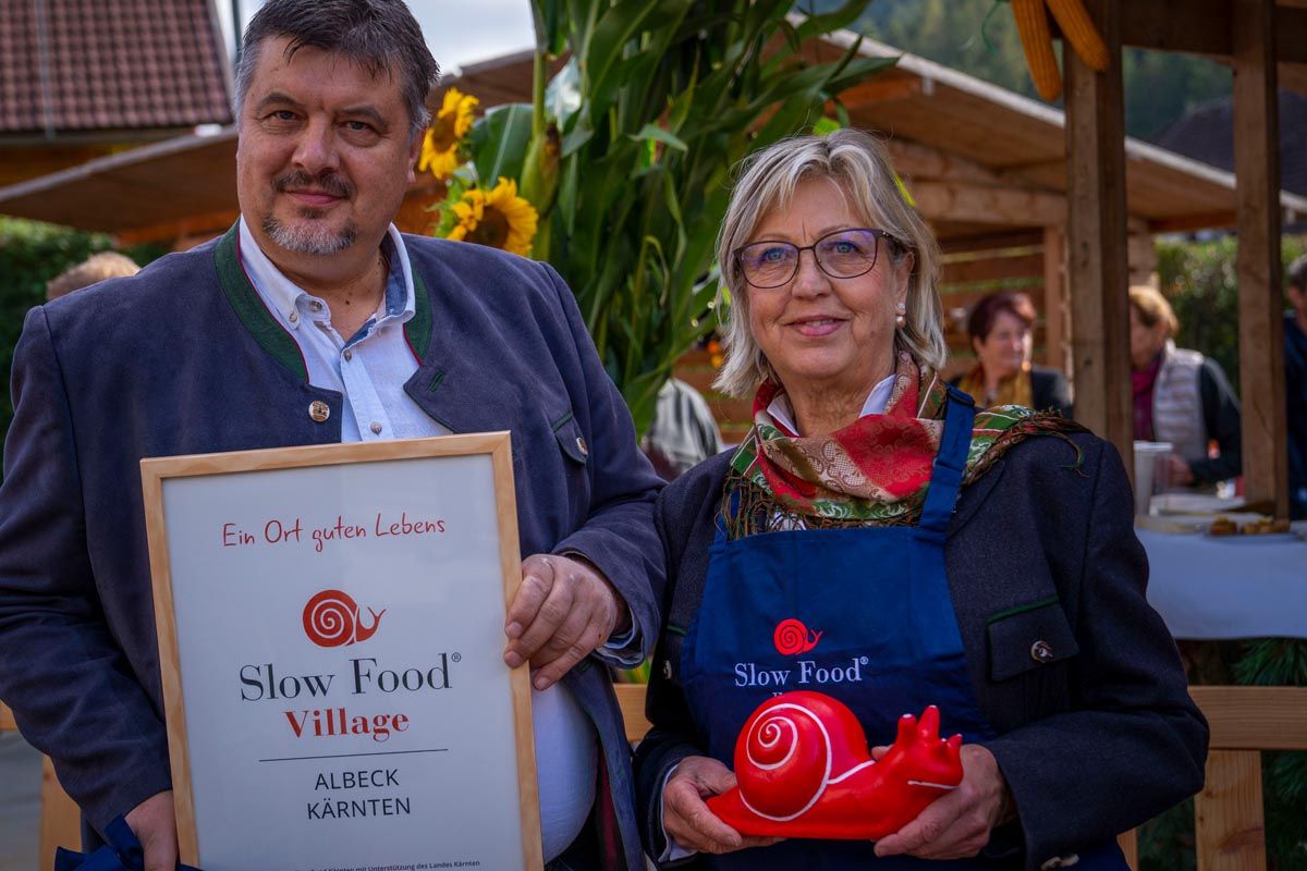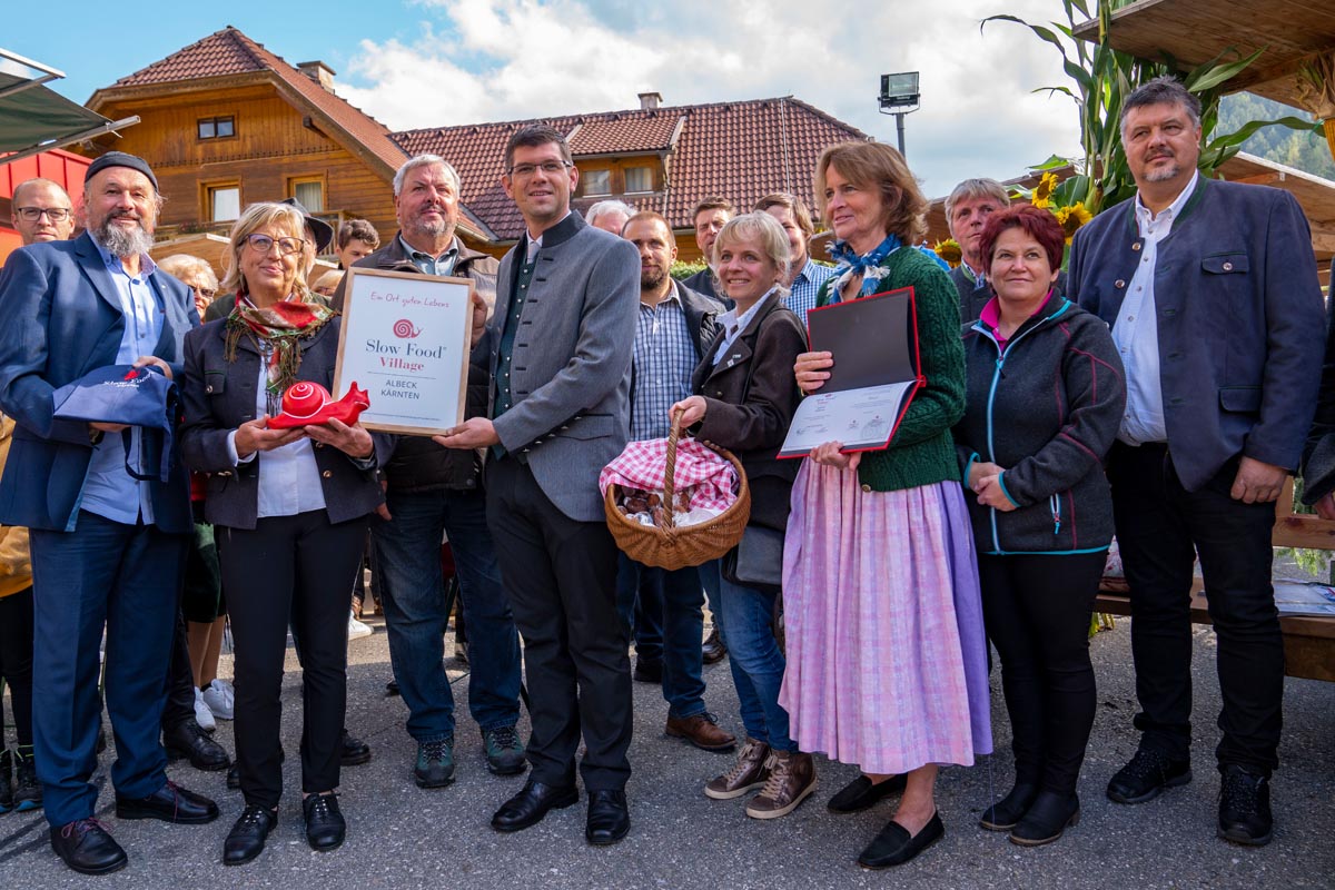 Im Rahmen eines Festaktes wurde Albeck als 10. Kärntner „Slow Food Village“ aufgenommen. Slow Food ist eine Lebensphilosophie. Es geht um gute Ernährung, Esskultur, Nachhaltigkeit, aber auch ums Miteinander, um Respekt und die Wahrung unserer und der Würde des Nächsten. Mastermind hinter dieser Initiative, dass Albeck nun ein Slow Food Village wurde, ist Annegret Zarre, die mit viel Engagement dieses Projekt konsequent begleitet hat. „Konsumenten sind auch Co-Produzenten“ – so eine der Kernaussagen von Kärntens Slow Food Obmann Gottfried Bachler, der Annegret Zarre die begehrte Urkunde überreichte. Neben Bgm. Wilfried Mödritscher haben auch VertreterInnen der Gemeinde Albeck, Landesrat Martin Gruber, viele Ehrengäste, die ProduzentInnen und natürlich viele AlbeckerInnen teilgenommen.